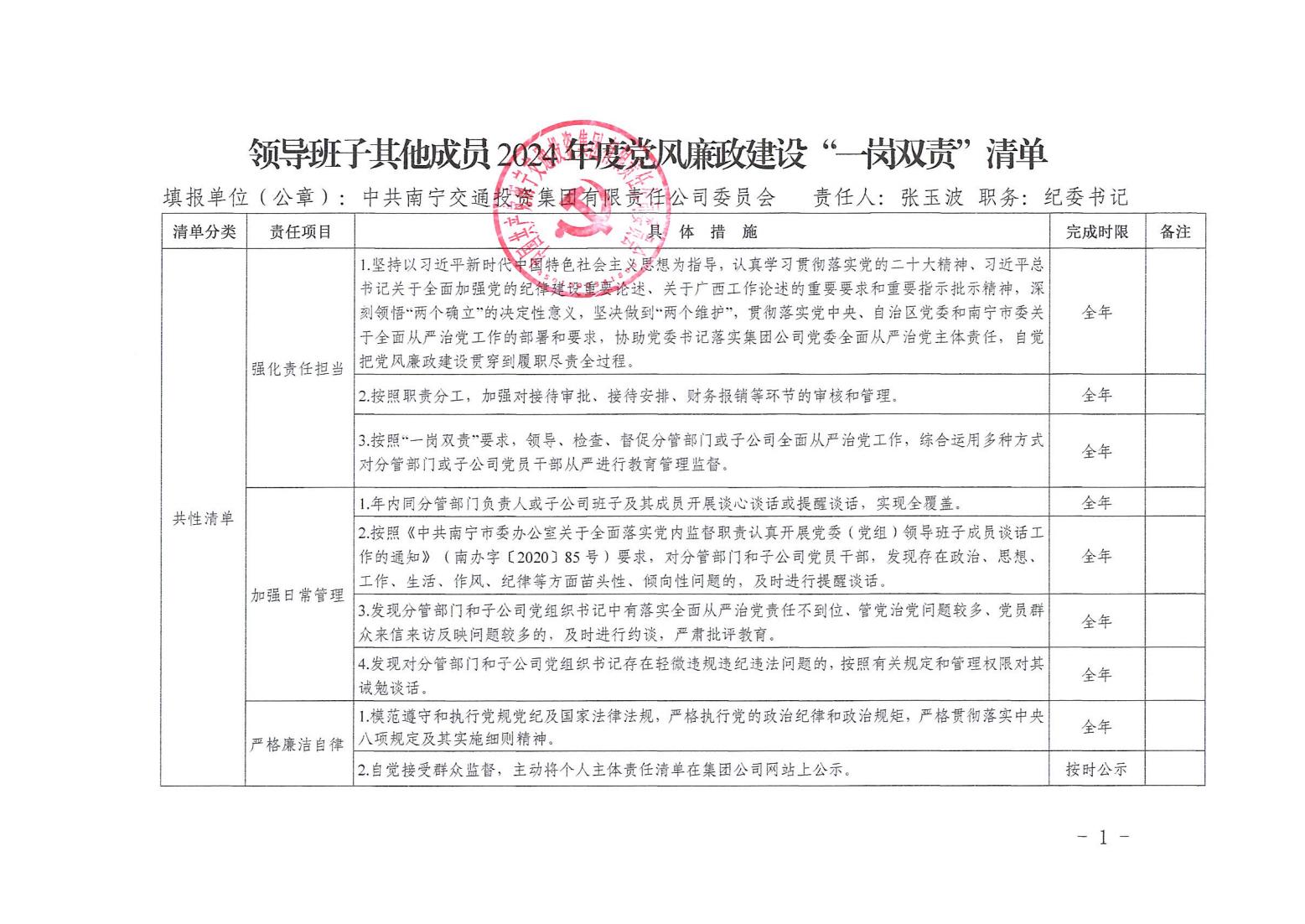 領(lǐng)導(dǎo)班子其他成員2024年度黨風廉政建設(shè)“一崗雙責”清單(一)