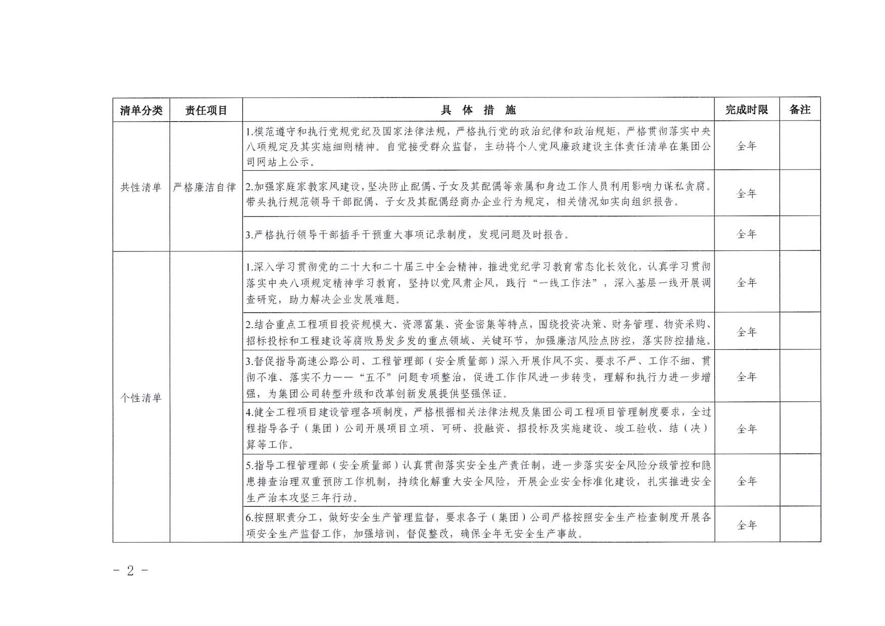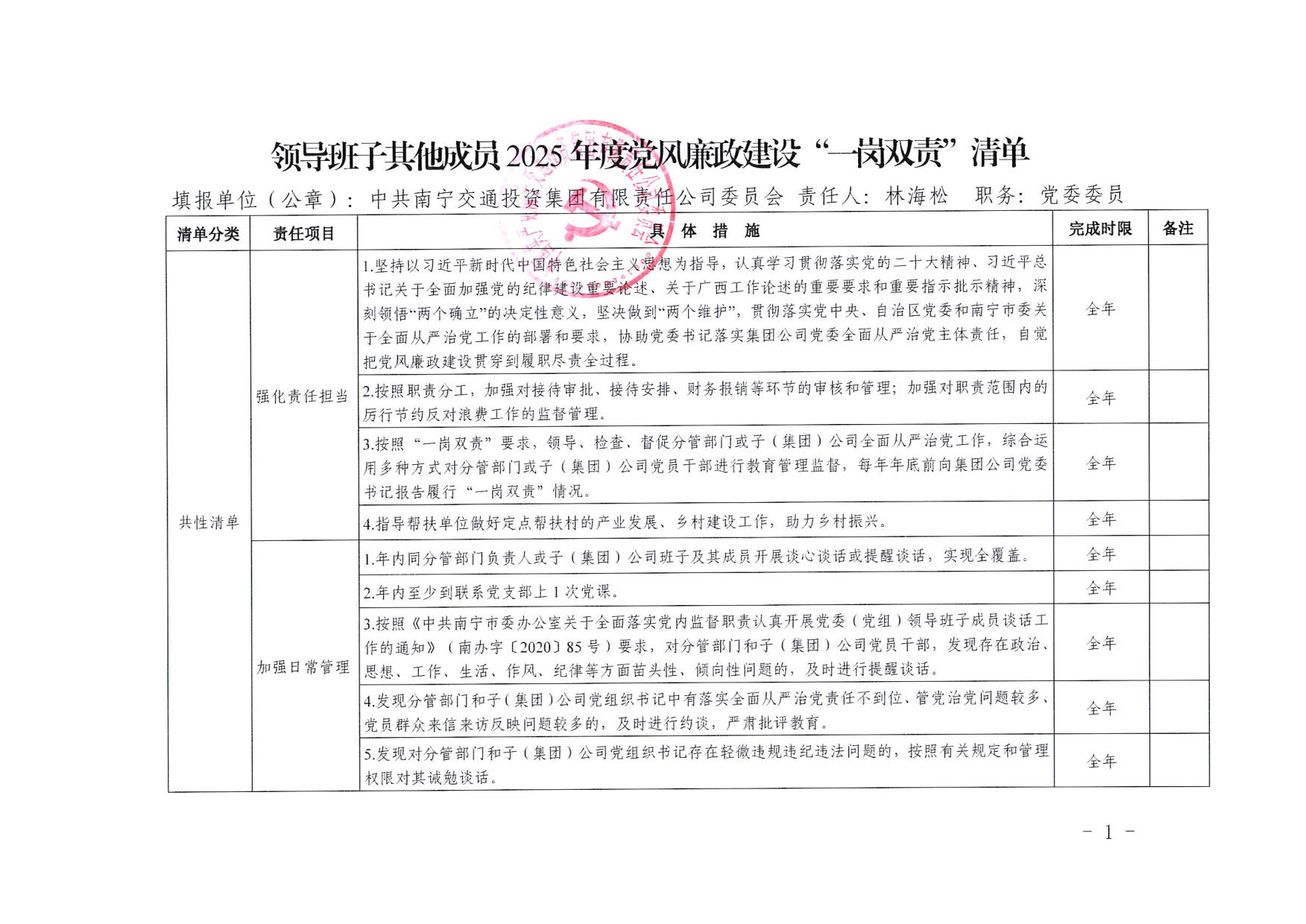 南寧交投集團領導班子其他成員2025年度黨風廉政建設“一崗雙責”清單(二)
