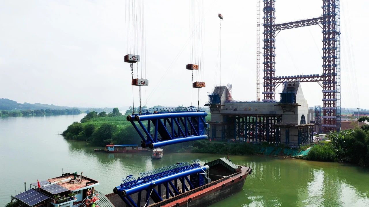 首節(jié)拱肋吊裝前,南寧二環(huán)高速公司組織參建各方進行了全面的安全技術(shù)交底,對纜索吊塔架、卷揚機等關(guān)鍵設(shè)備進行多輪檢查和調(diào)試。吊裝過程中,技術(shù)人員對拱肋的位置、角度進行實時監(jiān)測,通過纜索吊裝系統(tǒng)的智能監(jiān)控監(jiān)測系統(tǒng)和特種設(shè)備傳感器,實時監(jiān)控吊裝構(gòu)件的偏位及受力情況,確保吊裝精度和過程作業(yè)安全;通過與海事部門的緊密合作,提前做好水上警戒措施。在充分的準(zhǔn)備和多次模擬演練的有力支撐下,首節(jié)拱肋精準(zhǔn)完成安裝,為后續(xù)拱肋節(jié)段的安裝奠定了堅實基礎(chǔ)。